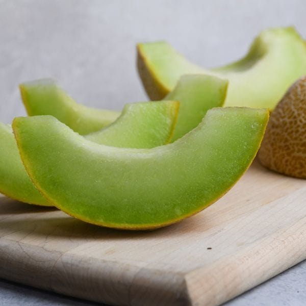 The Galia Melon is a cross between a Cantaloupe and a Honeydew Melon, combining the best of both melons into one. The outside looks like a Cantaloupe while the inside looks like a Honeydew Melon.