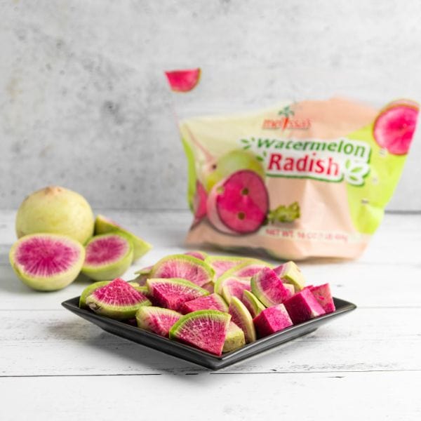 Watermelon Radishes have a crisp texture and are ideal for eating out of hand. Because of their large size and beautiful color, they stand out on appetizer and cheese platters and are beautiful when used as a garnish. Melissa’s Watermelon Radishes are delicious served in salads or for a hot dish steamed with other veggies.