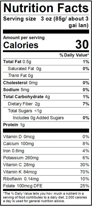 Gai Lan from Melissa’s is hand-selected for excellent quality. Choose heads with full, dark green leaves and fresh stalks. Avoid any brown spots which could indicate decay. Use as soon as possible and refrigerate, unwashed in a plastic bag for no more than 2-3 days.