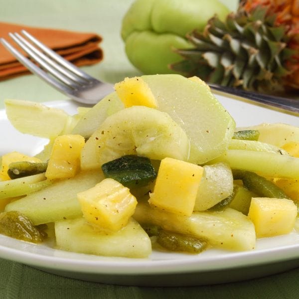 Use caution when handling spiney chayote as the spines are sharp and it releases a sticky latex when peeled that can irritate your skin. We recommend wearing gloves. To peel chayote, cut both ends and shave off the spines and skin with a paring knife or Y-peeler. From there, chayote can be sliced, cubed or even spiralized to make noodles.