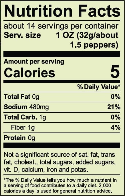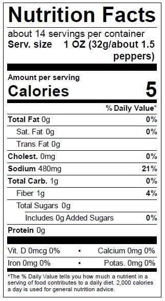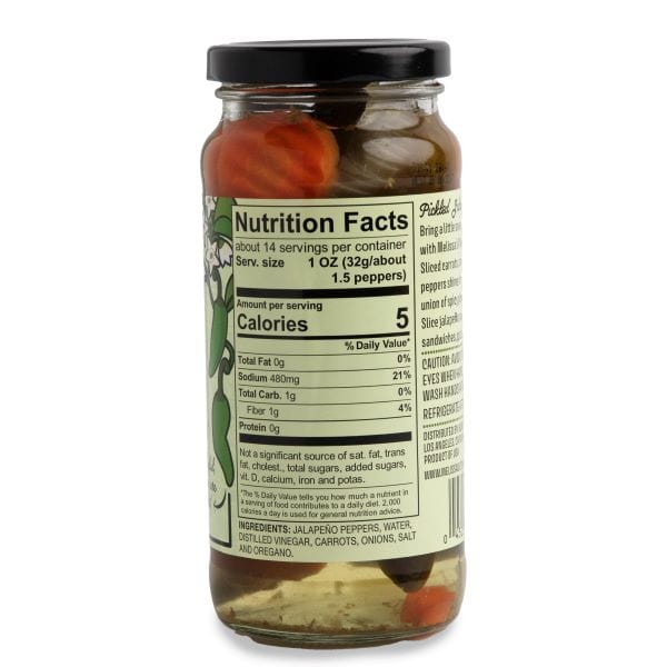 Ingredients: Jalapeño Peppers, Water, Distilled Vinegar, Carrots, Onions, Salt and Oregano.