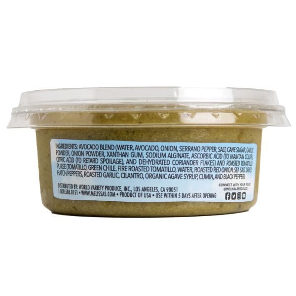 Ingredients: Avocado Blend (Water, Avocado, Onion, Serrano Pepper, Salt, Cane Sugar, Garlic Powder, Onion Powder, Xanthan Gum, Sodium Alginate, Ascorbic Acid (To Maintain Color), Citric Acid (To Retard Spoilage), and Dehydrated Coriander Flakes), Roasted Tomatillo Puree (Tomatillo, Green Chile, Fire Roasted Tomatillo, Water, Roasted Red Onion, Sea Salt, Dried Hatch Peppers, Roasted Garlic, Cilantro, Organic Agave Syrup, Cumin, Black Pepper).