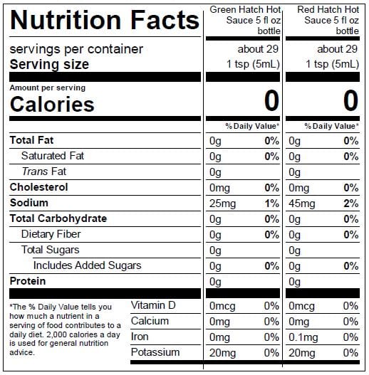 Red Hatch Hot Sauce Ingredients: Water, Tomato Paste, Vinegar, Dried Hatch Peppers, Salt, Dried De Árbol Peppers, Granulated Garlic, Cumin, and Xanthan Gum.