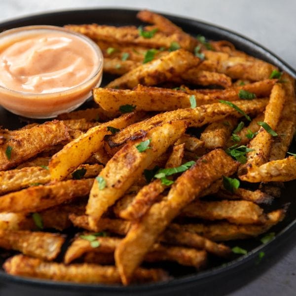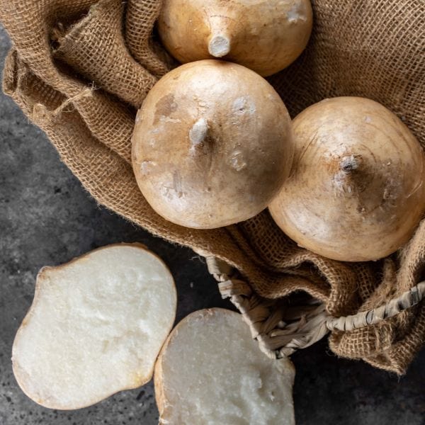 Jicama, also known as the Mexican potato/Mexican water chestnut/yam bean, is a large, bulbous root with thick brown skin on the outside and crisp white flesh on the inside. When taking a bite out of jicama, you will get a nice crunch paired with a mildly sweet, nutty flavor. The texture and taste of jicama are similar to that of a water chestnut. Jicama is low carb and packed with vitamin C, making it the perfect healthy snack.
