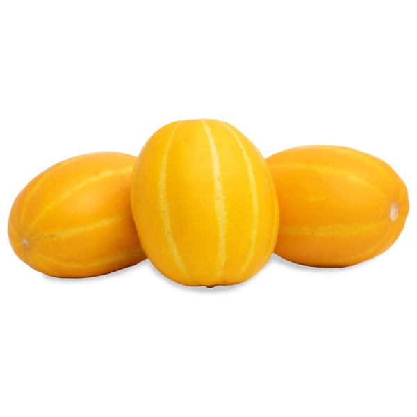 Single serving sized melons with an oval shape and deep yellow ridges, Korean melons have a juicy white flesh. They also have a large seed cavity in the center filled with edible seeds.