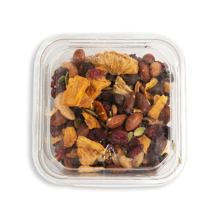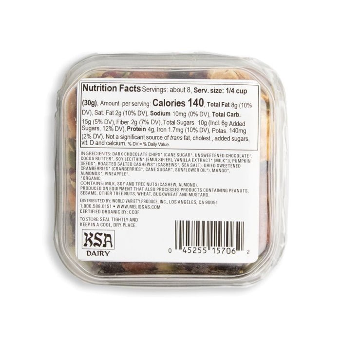 Ingredients: Dark Chocolate Chips* (Cane Sugar*, Unsweetened Chocolate*, Cocoa Butter*, Soy Lecithin* [Emulsifier, Vanilla Extract*), Pumpkin Seeds*, Roasted Salted Cashews* (Cashews*, Sea Salt), Dried Sweetened Cranberries* (Cranberries*, Cane Sugar*, Sunflower Oil*), Mango*, Almonds*, Pineapple*.