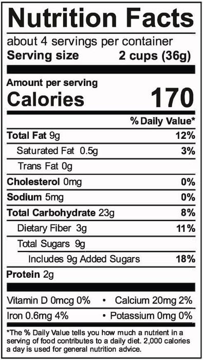 Ingredients: GMO-Free Popcorn, GMO-Free Sunflower Oil, Corn Oil, GMO-Free White Sugar, Powdered Sugar (Sugar, Cornstarch), FD&C Red #40, FD&C Yellow #6, FD&C Blue #1, and Natural and Artificial Flavor.