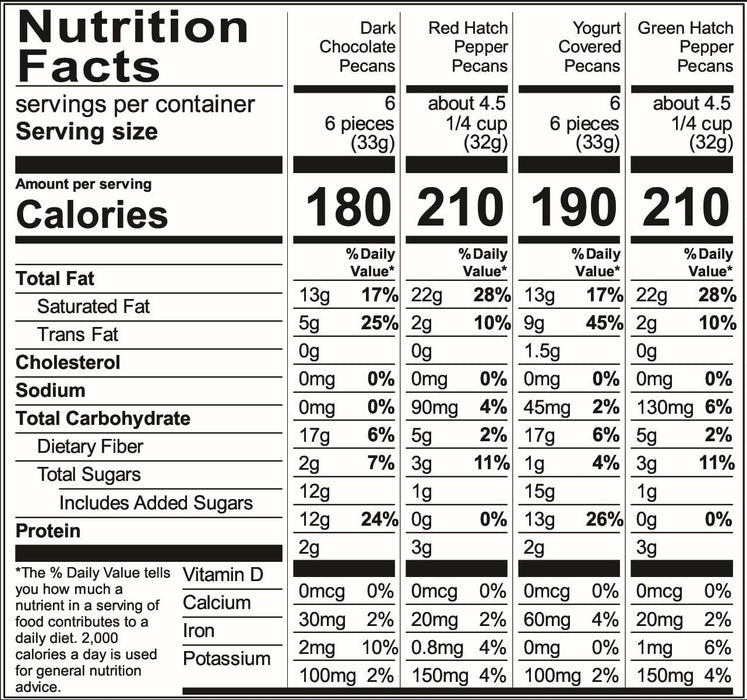 Red Hatch Pepper Pecans Ingredients: Pecans, Green Hatch Pepper Powder, Sea Salt, Soybean Oil, Citric Acid (Preservative).