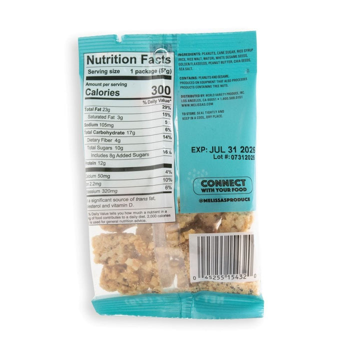 Ingredients: Peanuts, Cane Sugar, Rice Syrup (Rice, Rice Malt, Water), White Sesame Seeds, Golden Flaxseeds, Peanut Butter, Chia Seeds, Sea Salt.