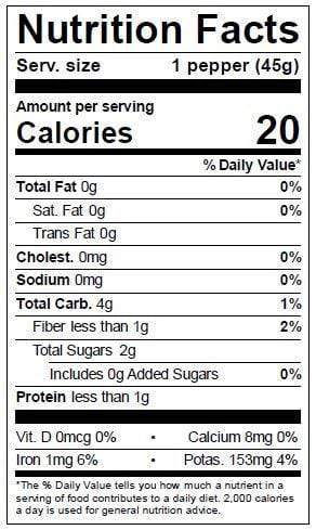 Melissa’s Hatch Peppers are hand-selected for excellent quality. Choose bright green, glossy peppers that are firm with medium to thick flesh. Avoid soft spots. Refrigerate, unwashed in a plastic bag for up to 5 days.