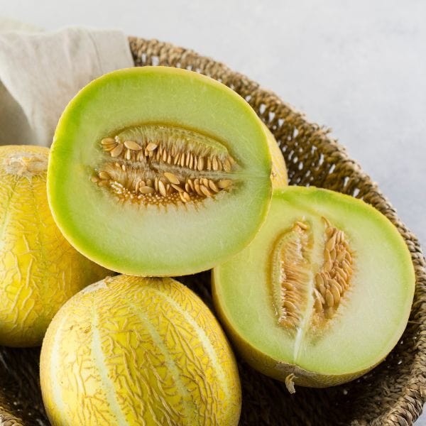 A hybrid of the Galia melon, the Lemon Drop Melon looks similar to its parentage with a netted, golden tan skin with distinctive light green grooves. The variety’s pale green interior fruit was purposely developed to have less sugar content and more citric acid. The result is a tart-sweet flavor, reminiscent of its lemon namesake along with a hint of honeydew juiciness. Lemon Drop melons are best eaten out of hand or used to make a refreshing summertime smoothie or sorbet. Combine chunks of this melon with sweet raspberries or strawberries for a delicious, fresh dessert.