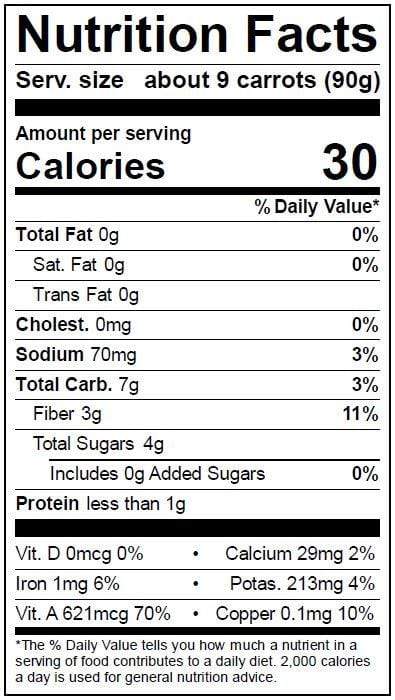 Sweet Baby Carrots are hand packaged for excellent quality. Store in the refrigerator’s vegetable bin or, after opening, in a plastic bag for up to 14 days.